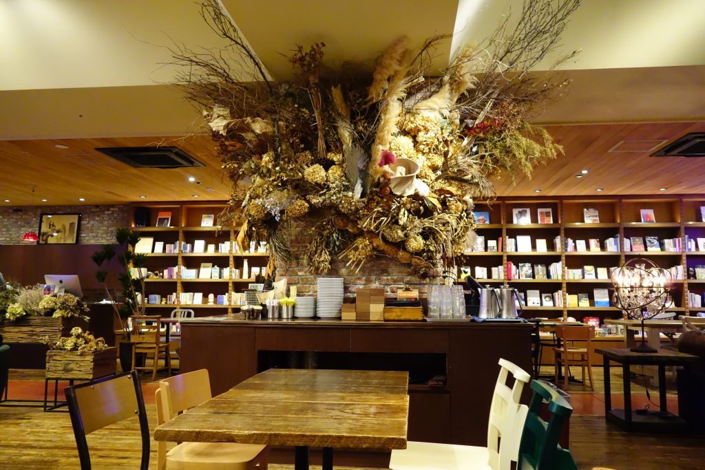 次は店内をチェックしてみましょう!お店に入ると大きな本棚と、グランドピアノ、広くて開放的な空間が目に入ります。ドライフラワーを使った巨大な生け花が随所にあります。